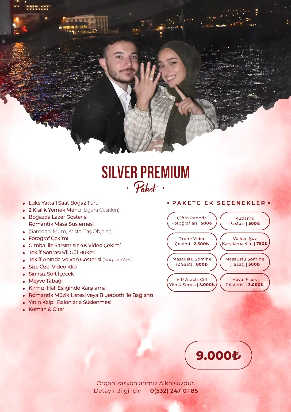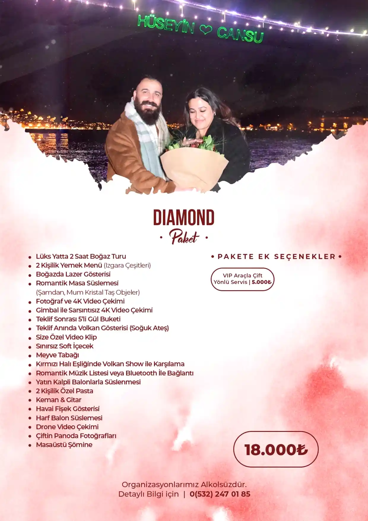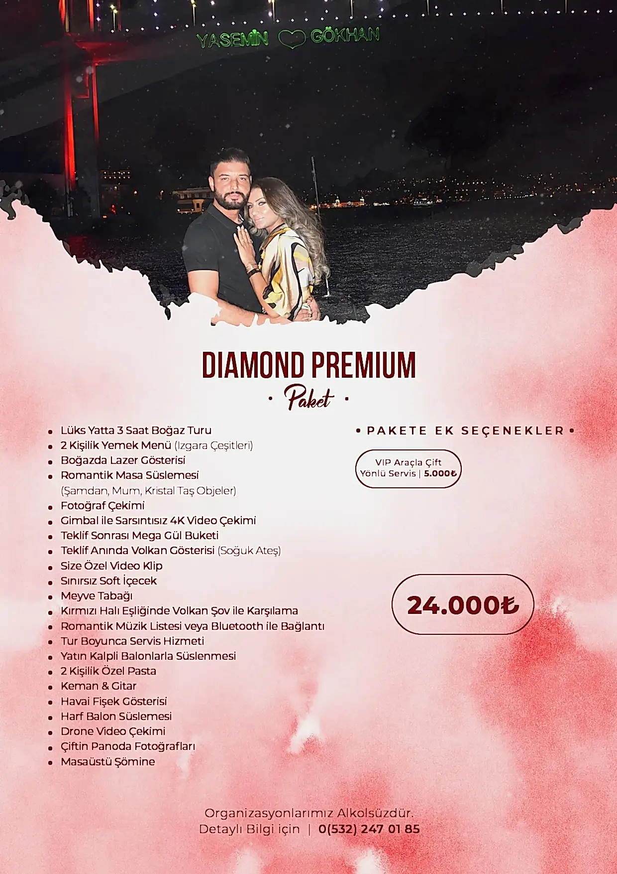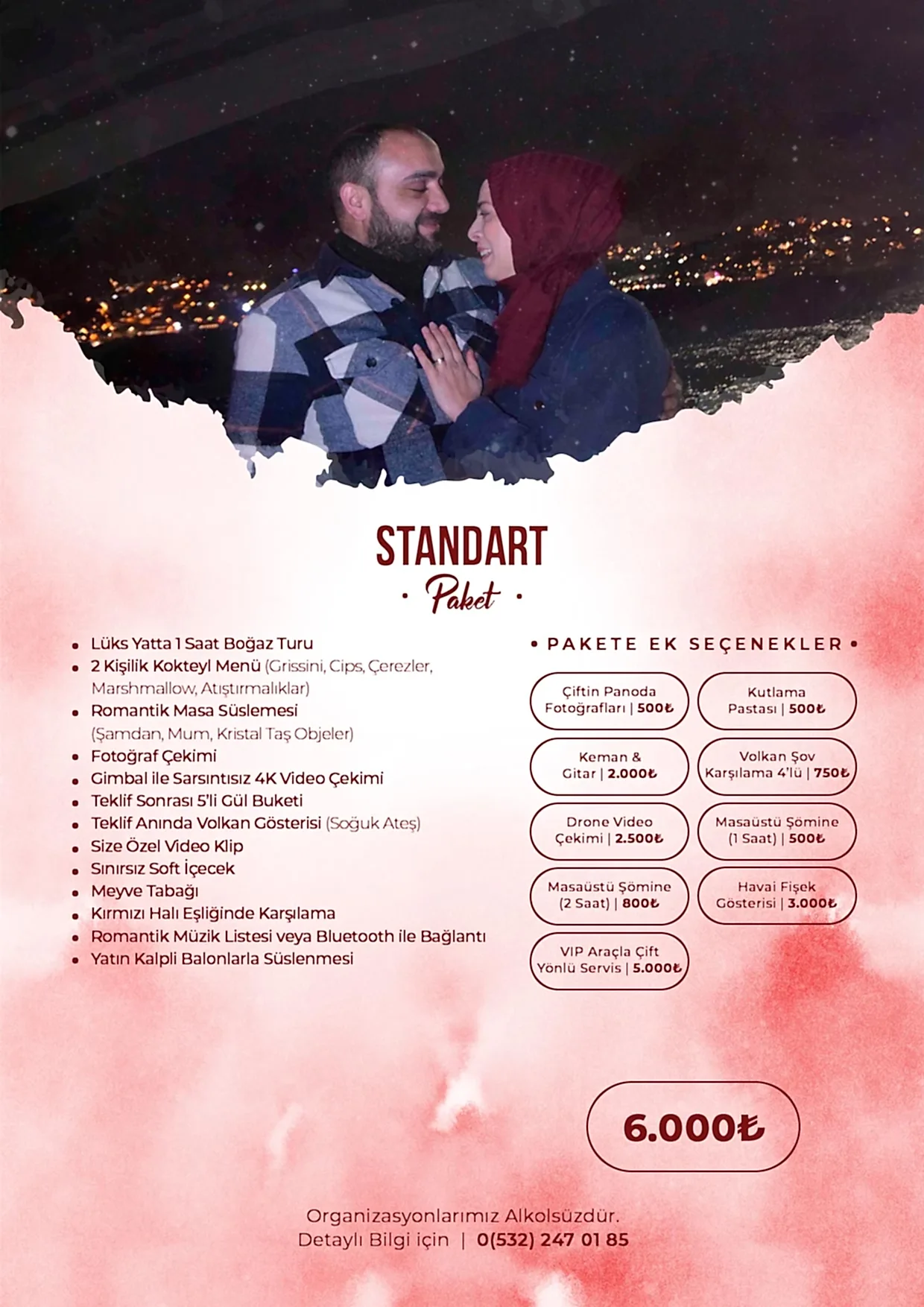 Romantik sürprizler ve etkileyici teklif organizasyonları konusunda uzman ekibimizle yanınızdayız. En güzel anı yaratmak için ihtiyaçlarınıza göre özel dekorasyon, mekân seçimi ve organizasyon hizmetleri sunuyoruz.