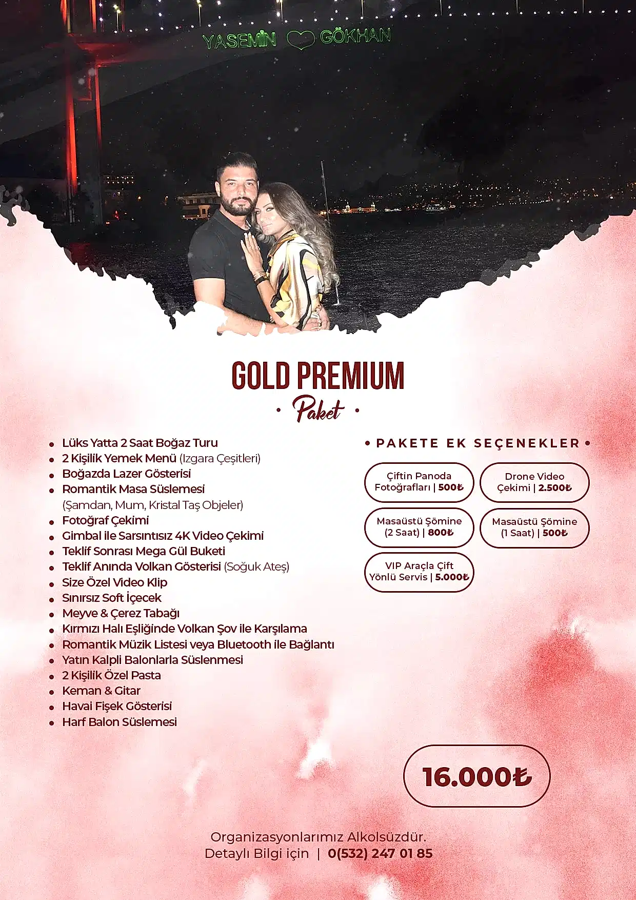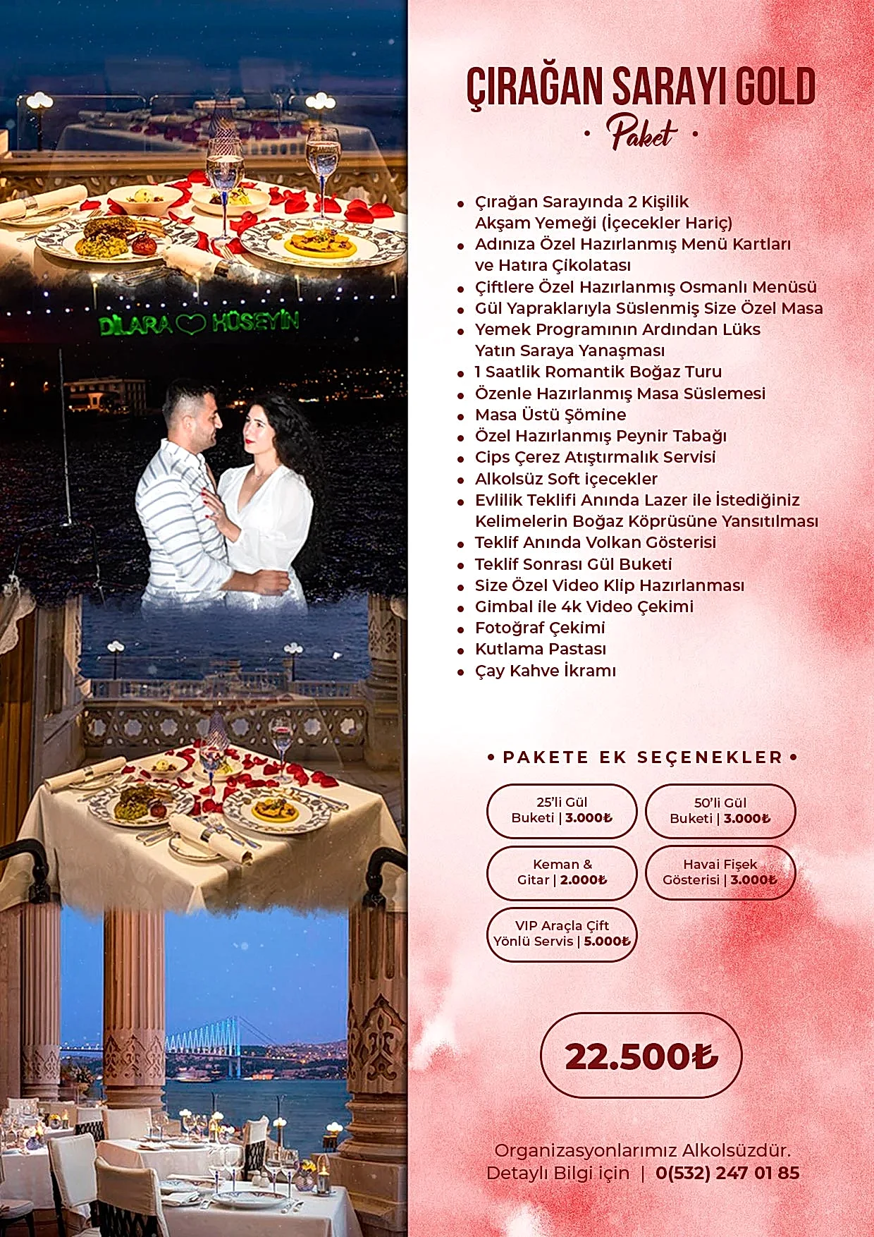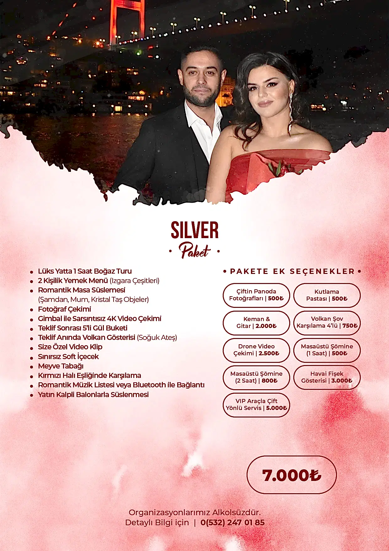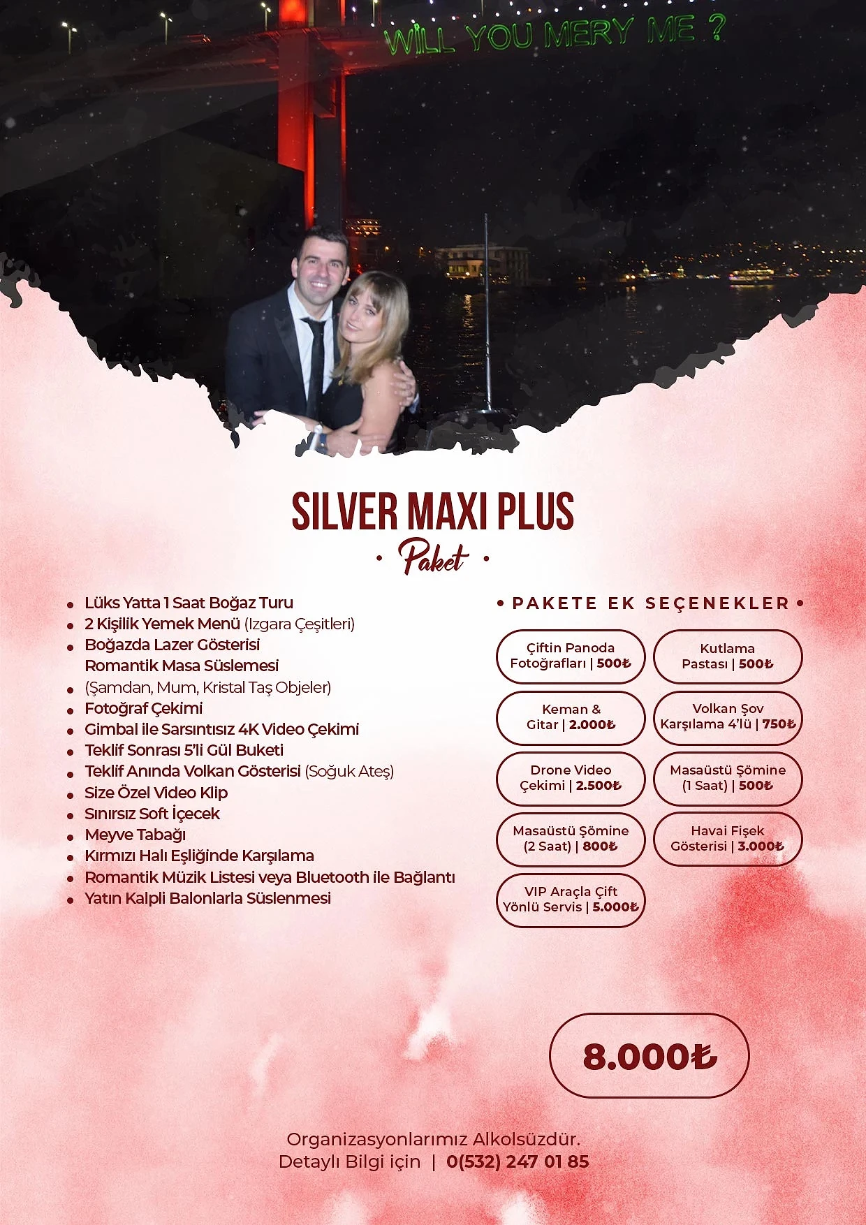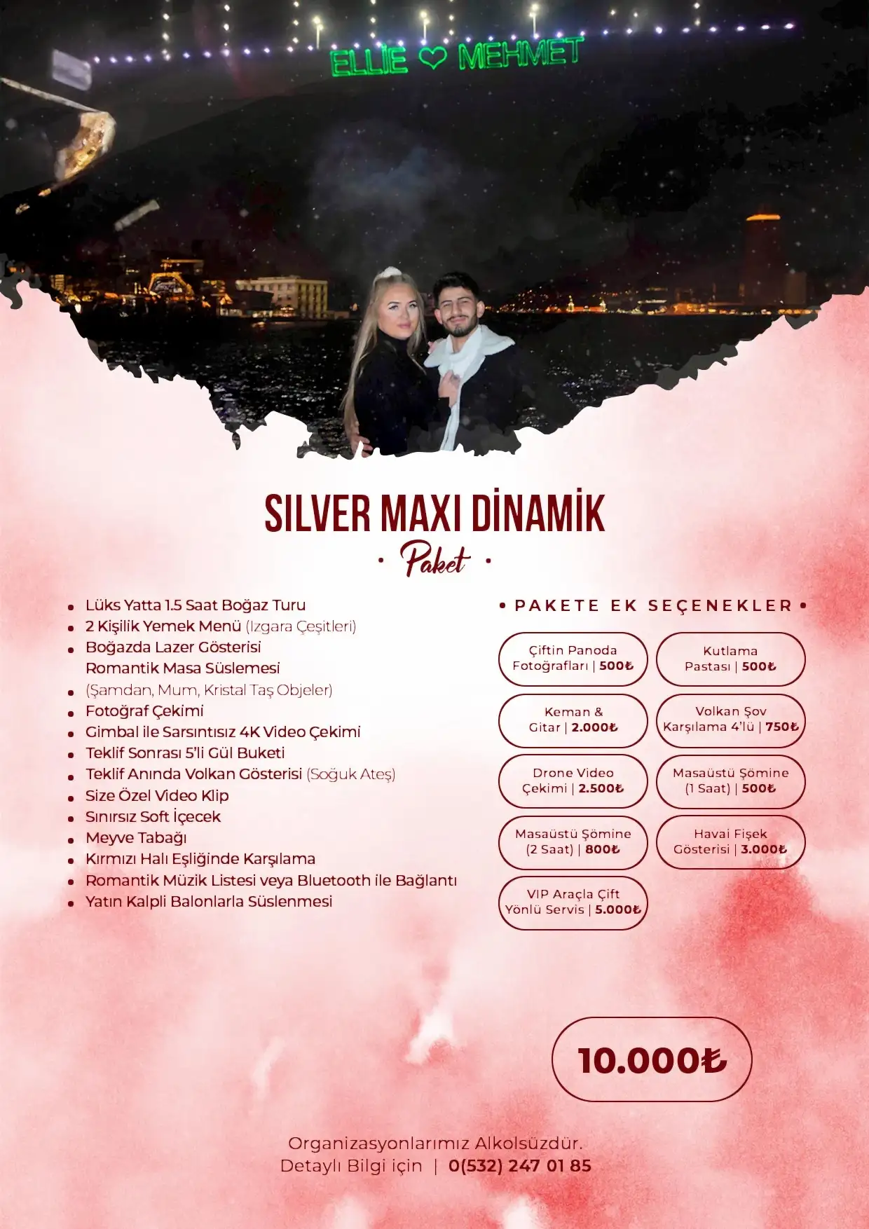 Romantik sürprizler ve etkileyici teklif organizasyonları konusunda uzman ekibimizle yanınızdayız. En güzel anı yaratmak için ihtiyaçlarınıza göre özel dekorasyon, mekân seçimi ve organizasyon hizmetleri sunuyoruz.