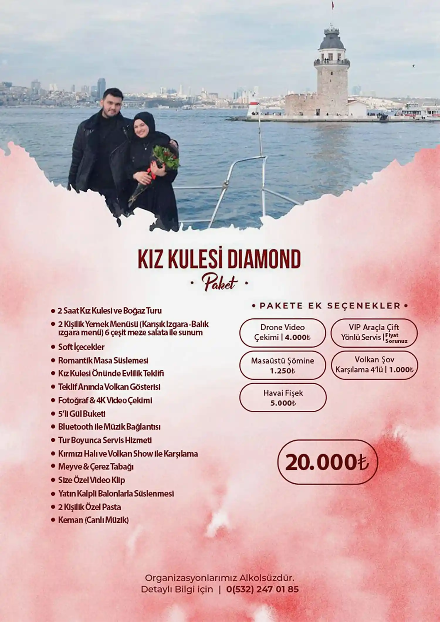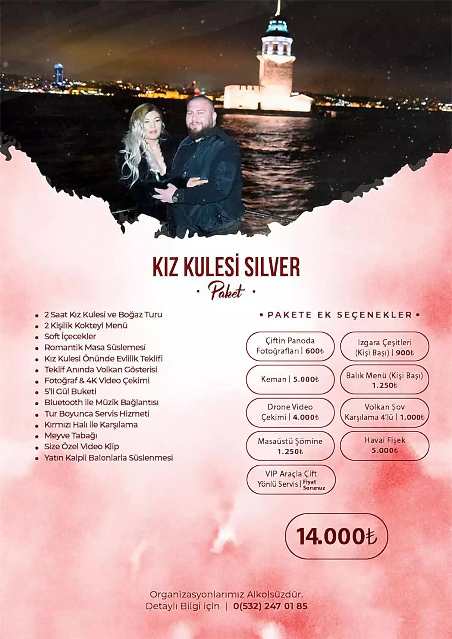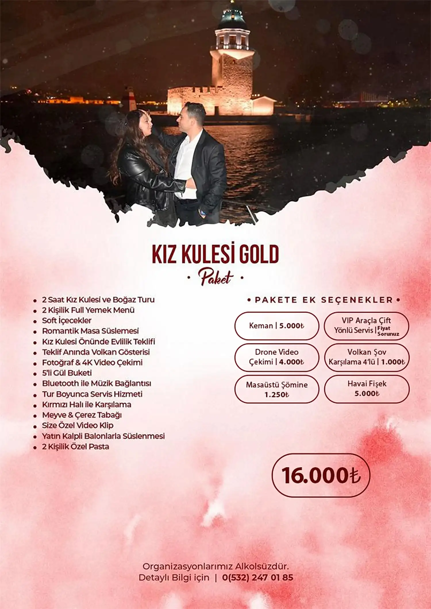 Evlilik teklifiniz için Kız Kulesi’nin panoramik manzarası eşliğinde düzenleyeceğimiz özel bir atmosfer, anınıza anlam katacaktır. Gün batımında altın sarısı ışıkların suyun üzerinde dans etmesi, romantizmi doruk noktasına ulaştıracak. İster şampanya ile kutlayın, ister en sevdiklerinizi yanınıza alarak mutluluğunuzu paylaşın, her detay sizin hayallerinizi gerçekleştirmek için tasarlanacak. Böylece, sevdiklerinizle birlikte paylaştığınız bu özel an, hafızalarınızda daima yer edinecek.
