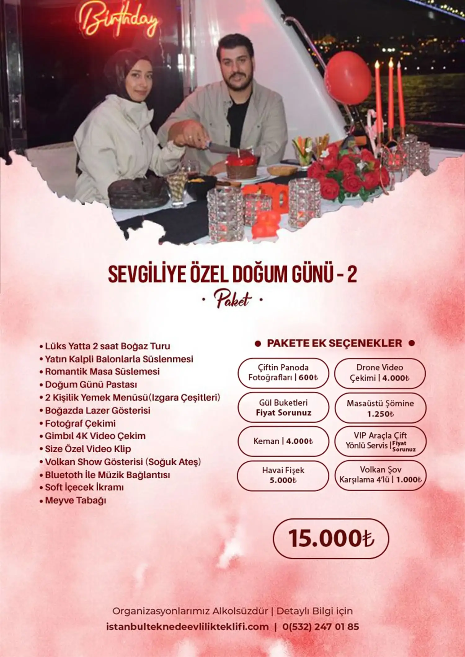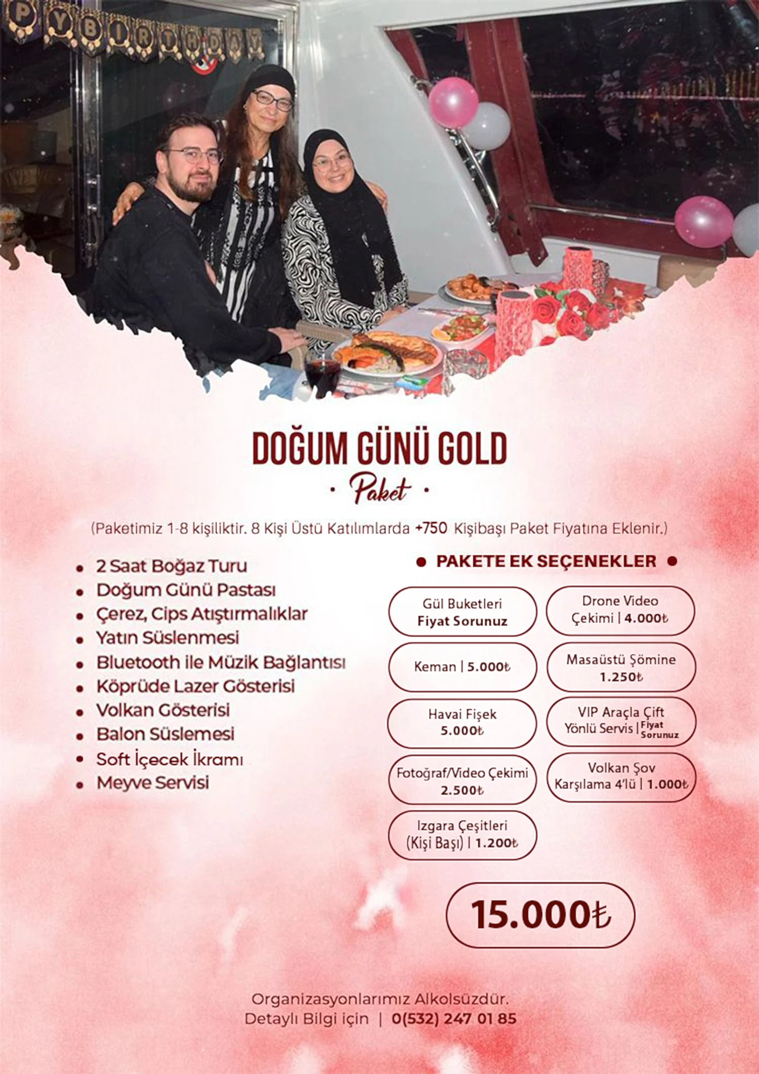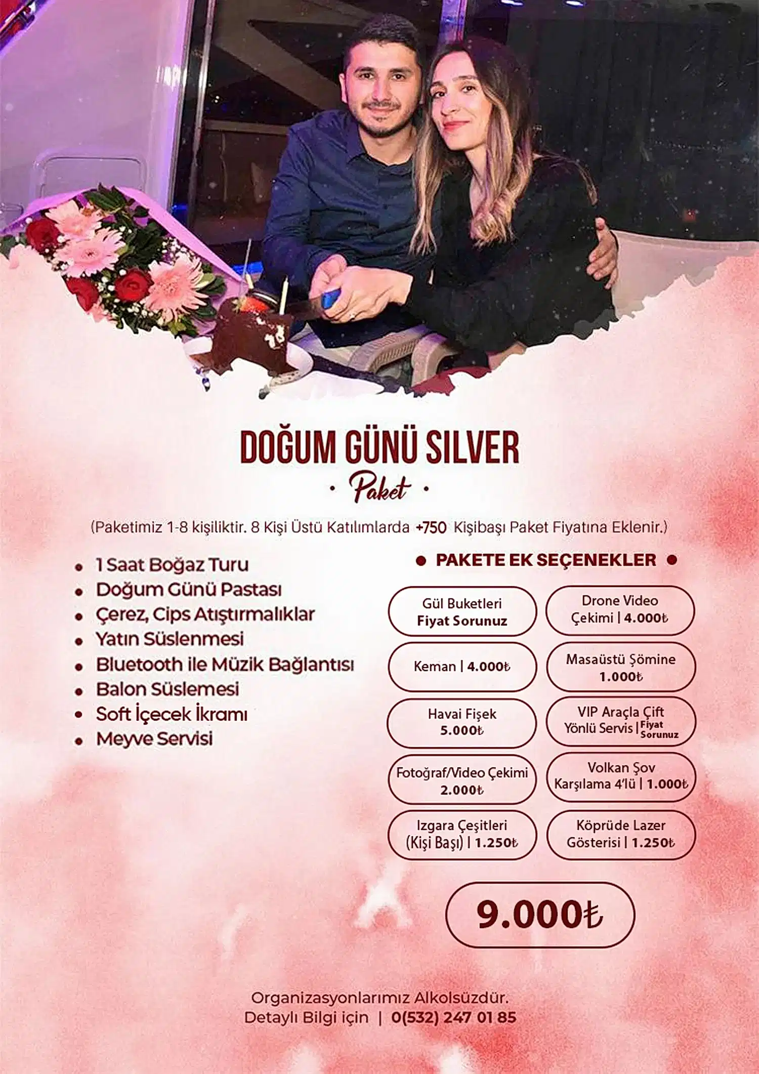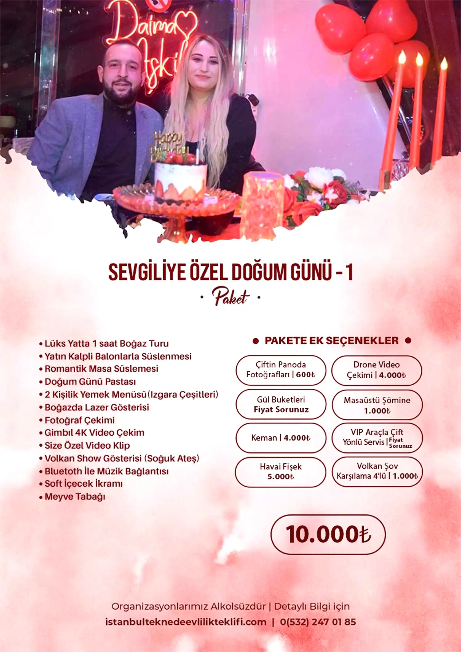 Yatta doğum günü etkinlikleri tamamen kişiye özel olarak düzenlenir. Menüden müziğe, dekorasyondan rotaya kadar her detay sizin tercihinize göre şekillenir.