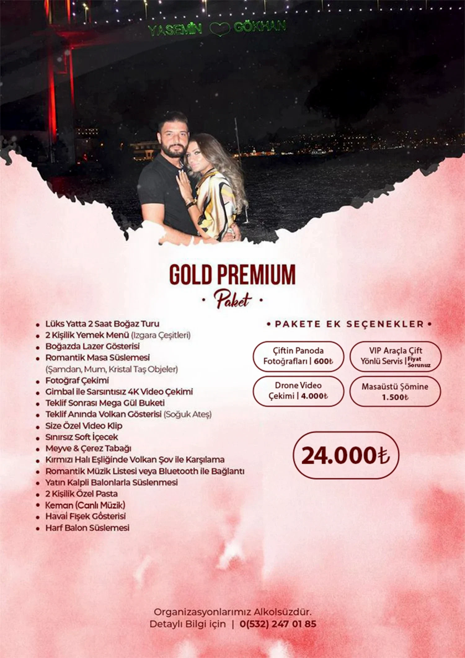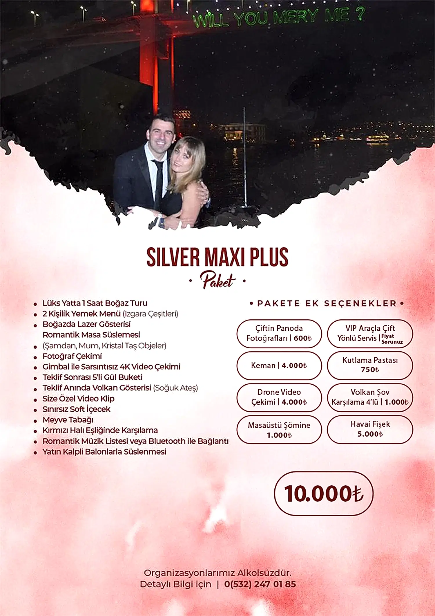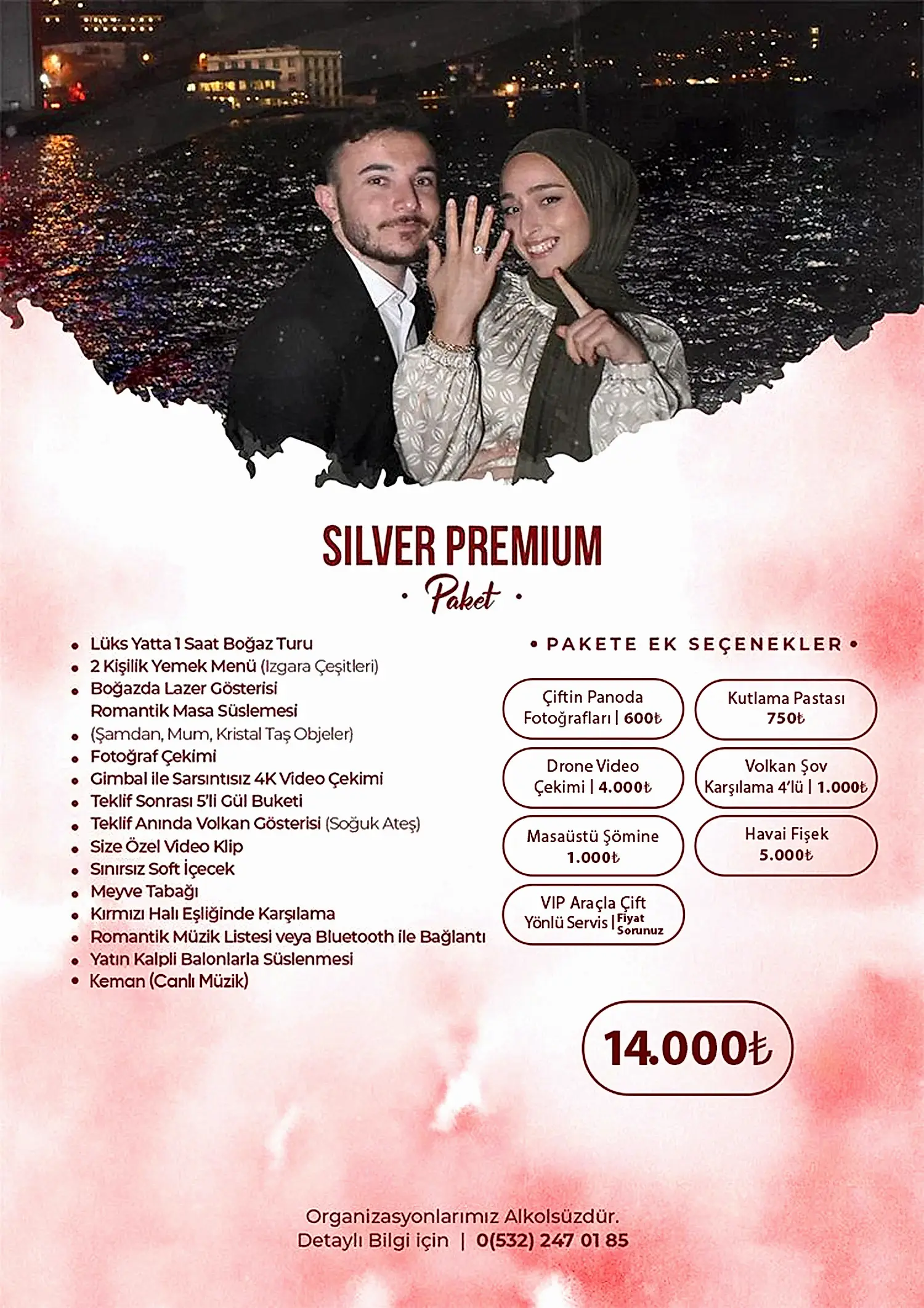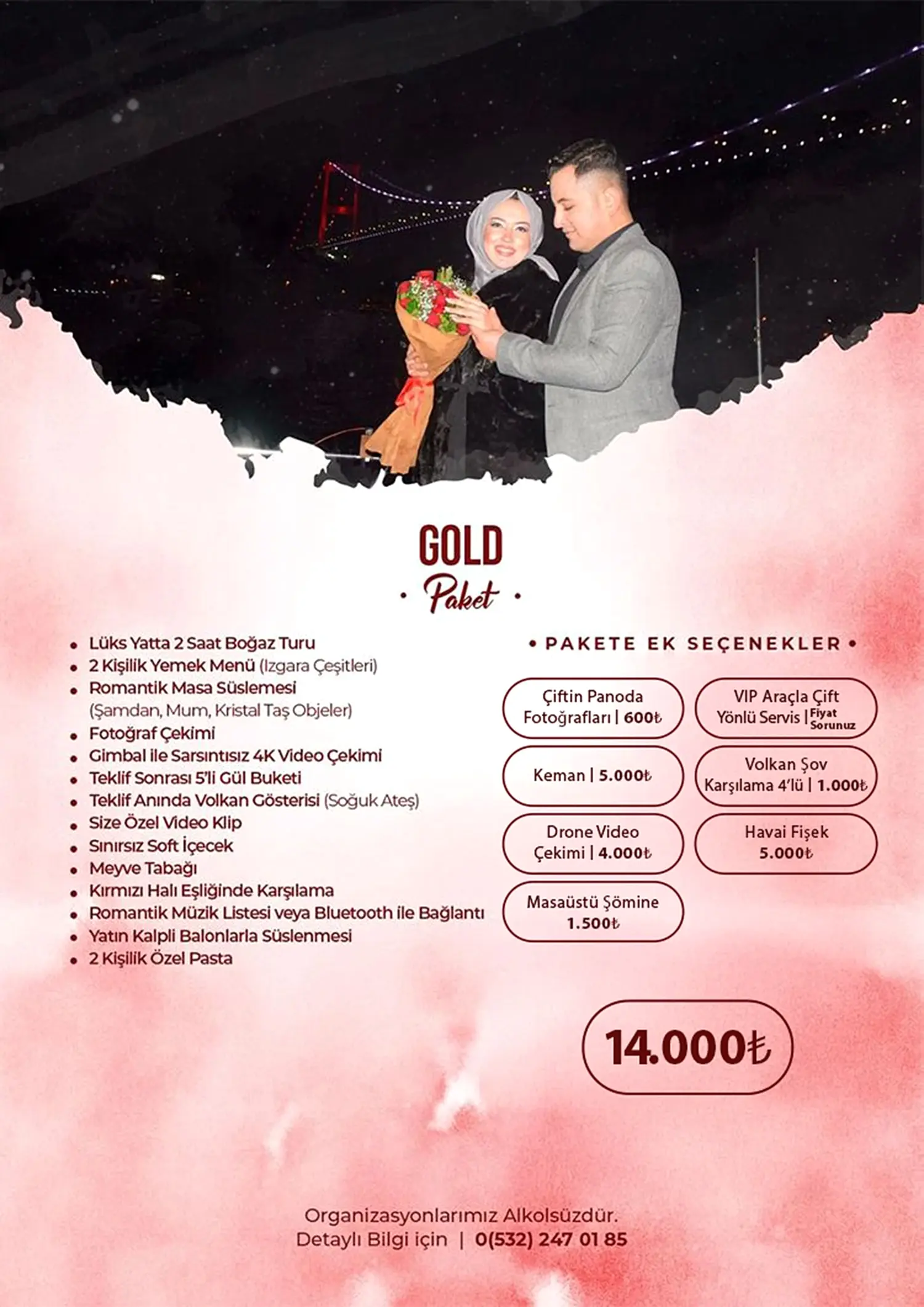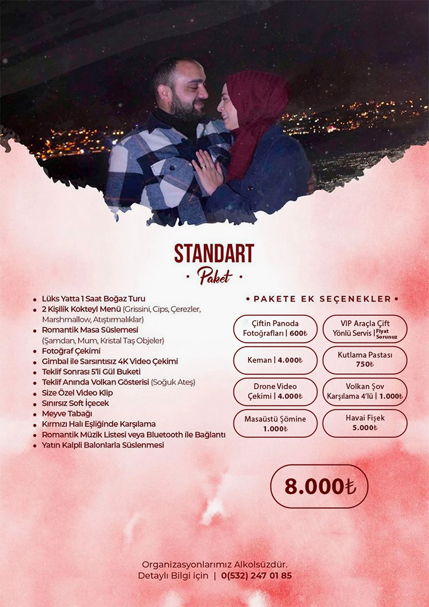 Boğazda evlilik teklifi yapmak isteyenler için fiyatlar, teklifin yapılacağı mekana, kullanılan araç gereçlere ve organizasyon hizmetlerine bağlı olarak değişir. Boğazda evlilik teklifi fiyatları, genellikle istenilen özelliklere göre şekillenir. Bir yatta evlenme teklifi yapmak isterseniz, yatın kiralanma süresi, iç dekorasyon, yemek servisi ve kişiye özel detaylar fiyatı etkileyen unsurlar arasında yer alır. Fakat her bütçeye uygun seçenekler bulmak mümkündür. Romantik bir akşam yemeği eşliğinde yapılacak bir teklif ile daha lüks bir yat gezisi ile yapılacak teklif arasındaki fiyat farkı, sizin tercihinize göre şekillenecektir.