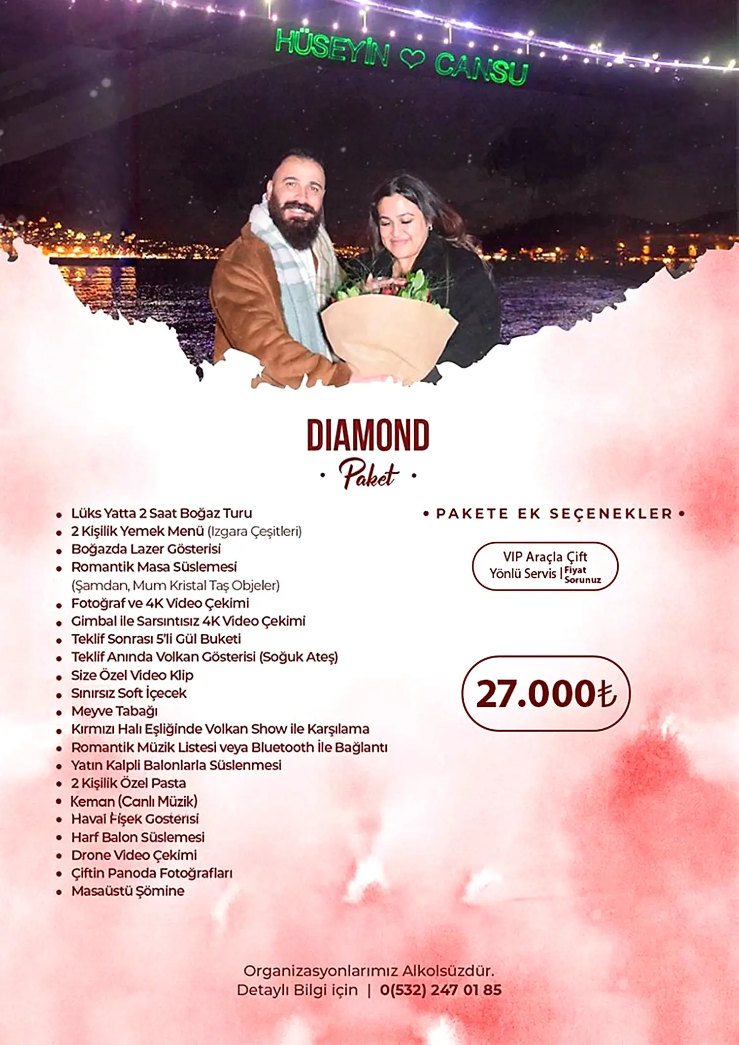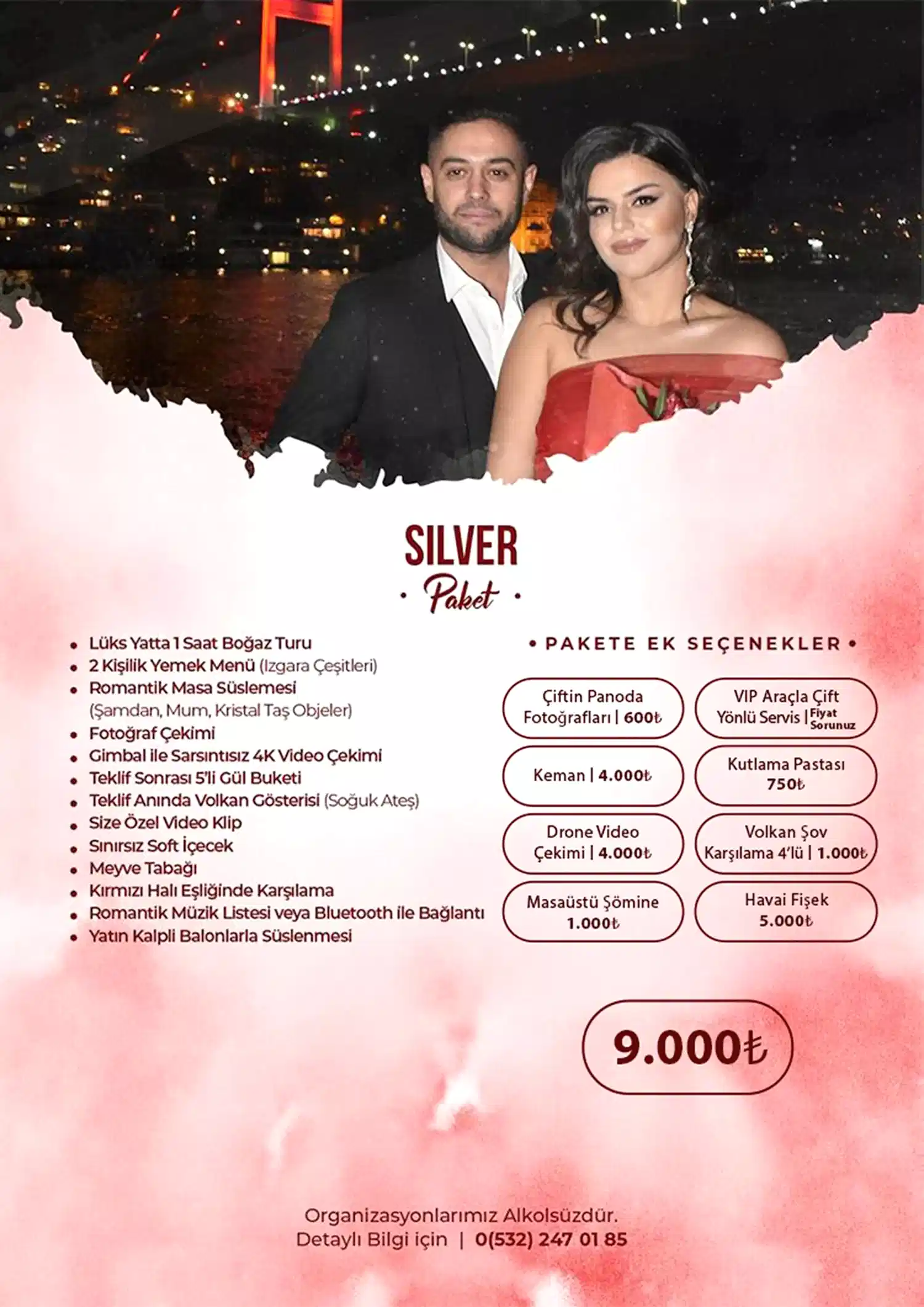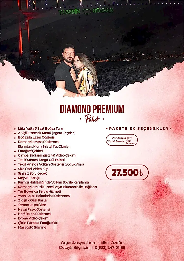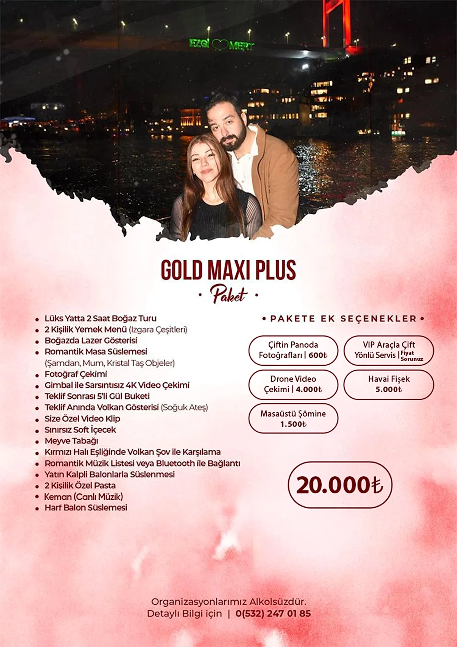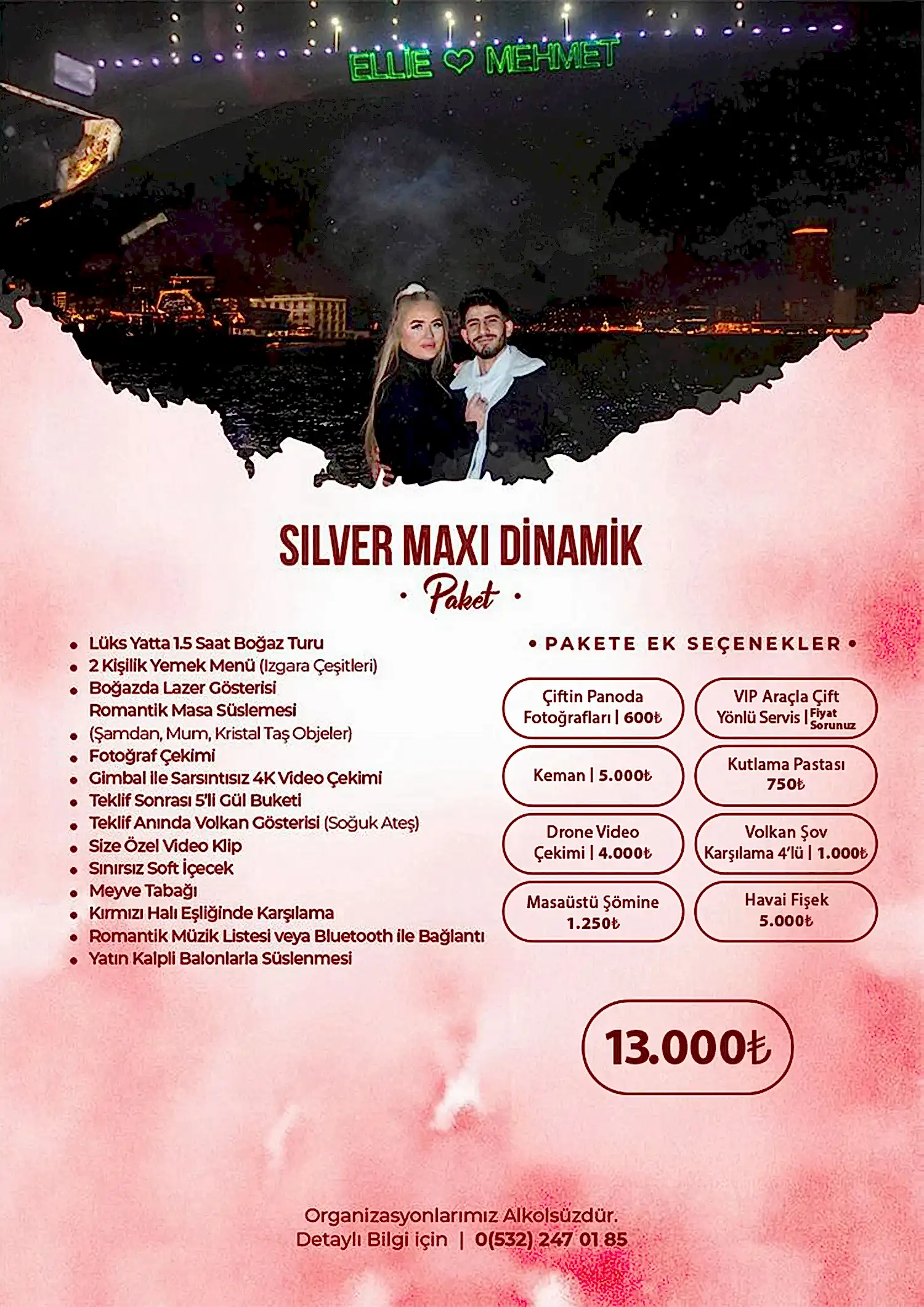 Boğazda evlilik teklifi yapmak isteyenler için fiyatlar, teklifin yapılacağı mekana, kullanılan araç gereçlere ve organizasyon hizmetlerine bağlı olarak değişir. Boğazda evlilik teklifi fiyatları, genellikle istenilen özelliklere göre şekillenir. Bir yatta evlenme teklifi yapmak isterseniz, yatın kiralanma süresi, iç dekorasyon, yemek servisi ve kişiye özel detaylar fiyatı etkileyen unsurlar arasında yer alır. Fakat her bütçeye uygun seçenekler bulmak mümkündür. Romantik bir akşam yemeği eşliğinde yapılacak bir teklif ile daha lüks bir yat gezisi ile yapılacak teklif arasındaki fiyat farkı, sizin tercihinize göre şekillenecektir.
