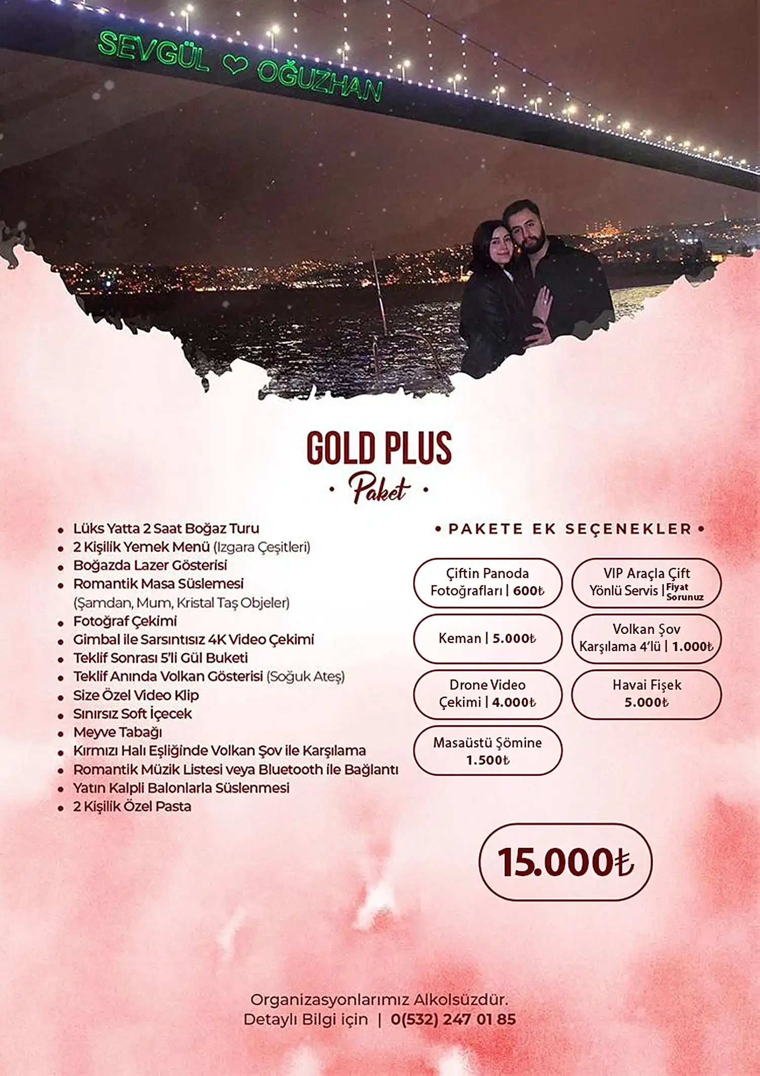 Deneyimli ve güler yüzlü ekibimizle, misafirlerin tüm ihtiyaçlarında anında yanıt veririz. Fotoğraf ve video çekimi, canlı müzik ya da özel yemek gibi kişiye özel hizmetler sunarız. Tekne veya yat evlenme teklifi için güzel anılarla dolu bir deneyim olacaktır.